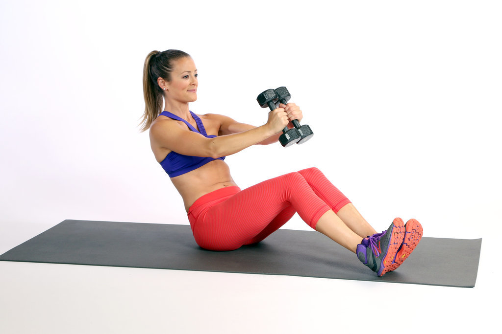 • Lie on your back, holding weights in each hand, and reach your arms rigidly to your side, off the floor. Lift your legs off the floor, and point them, so they are at about a 45-degree angle. Lift your head, so your shoulders are off the floor as well.