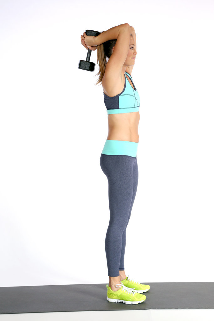 • Straighten your legs, then bring your arms up, holding the dumbbell, bending the elbows behind your head.